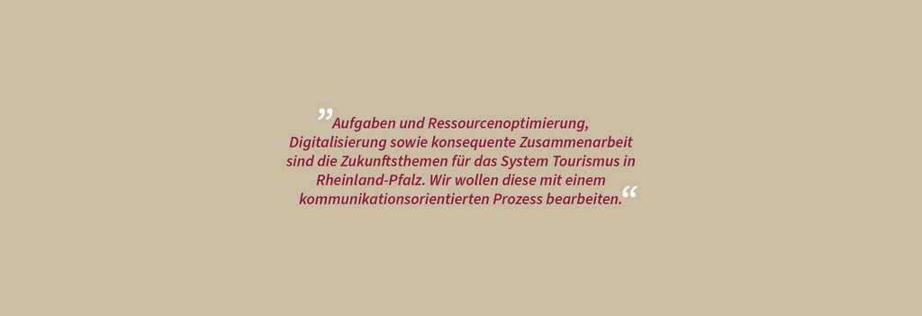 Nach der Vorlage des Gutachtens zum System Tourismus in Rheinland-Pfalz gilt es nun, optimale Strukturen und Aufgabenverteilungen in Form von Soll-Konzepten für die drei Ebenen (Landes-, Regional- und lokale Ebene) zu erarbeiten. Hierzu wurde ein Vergabeverfahren für die externe Moderation und Kooperation des Prozesses durchgeführt und die Bietergemeinschaft dwif/BTE beauftragt. Ein Beirat mit Vertretern aller Ebenen begleitet mit seiner Fachexpertise.