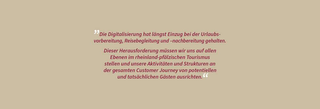 Es wurde ein strategischer Ansatz erarbeitet, der auf fünf Bausteinen basiert. Die Führung in der Steuerung und Umsetzung des gesamten Prozessverlaufs übernimmt die Rheinland-Pfalz Tourismus GmbH. Hierzu wurden drei neue Personalstellen ausgeschrieben. Mit dem Förderprogramm Digitalmanagement für die touristischen Regionen wurde eine gezielte Maßnahme zur Förderung der digitalen Transformation vom Ministerium für Wirtschaft, Verkehr, Landwirtschaft und Weinbau Rheinland-Pfalz angeboten.