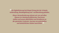 Die Corona-Krise hat nochmals deutlich gemacht, dass es zur Weiterentwicklung des Tourismus einer digital aufgestellten Branche bedarf. Es gilt, die digitale Leistungs- und Wettbewerbsfähigkeit auf allen Ebenen des Tourismus und bei den Funktionalpartnern sicher zu stellen.
