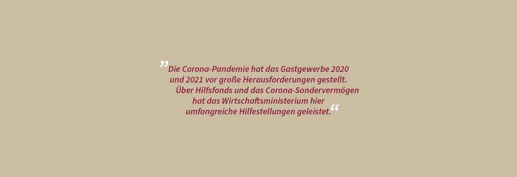 Das einzelbetriebliche Hotellerie-Förderprogramm wurde modifiziert und somit ein Sonderprogramm zur Abmilderung der Corona-Folgen in Höhe von insgesamt 13 Mio. € für das Gastgewerbe aufgelegt. Das Sonderprogramm ist gut angelaufen – mit derzeit 46 Förderanträgen, einer beantragten Gesamtzuwendung von rund 6,5 Mio. € wird ein Gesamtinvestitionsvolumen von rund 32,6 Mio. € ausgelöst. Die Projektpartner beschäftigten sich mit der Überprüfung bürokratischer Hemmnisse und initiierten ein erstes Treffen der rheinland-pfälzischen Bildungsträger im Tourismus.